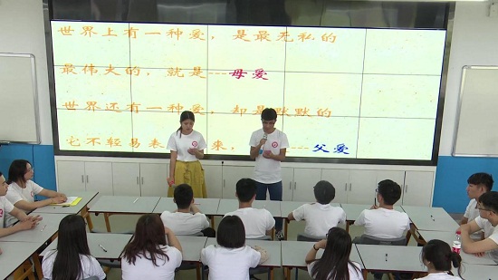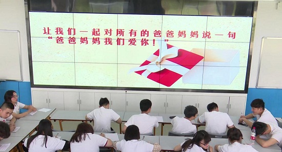 主持人分享了自己与妈妈的故事,进出主题班会的重要环节,现场连线父母,并大声说出“爸爸妈妈我爱你”。班会现场连线了三位家长。他们听到自己孩子很认真地大声说出爱自己时,激动不已,欣喜难忘。