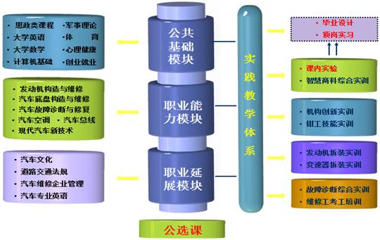 核心课程:汽车发动机构造与维修、汽车底盘构造与维修、汽车舒适与安全系统检修、汽车故障诊断与修复、汽车电子控制技术、钳工基本技能实训、汽车发动机拆装实训、变速器拆装实训、汽车维修工考工培训、智慧商科综合实训。
