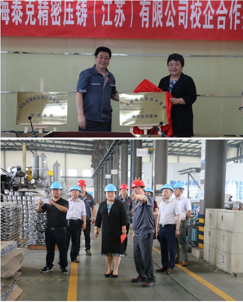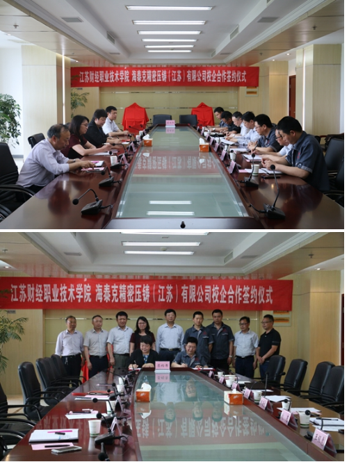 签约仪式上,杜萍副校长与海泰克精密压铸有限公司王海文总经理分别代表校企双方签订校企合作协议,并共同为“江苏财经职业技术海泰克公司实习实训基地”和“海泰克精密压铸有限公司江苏财经培训基地”揭牌。